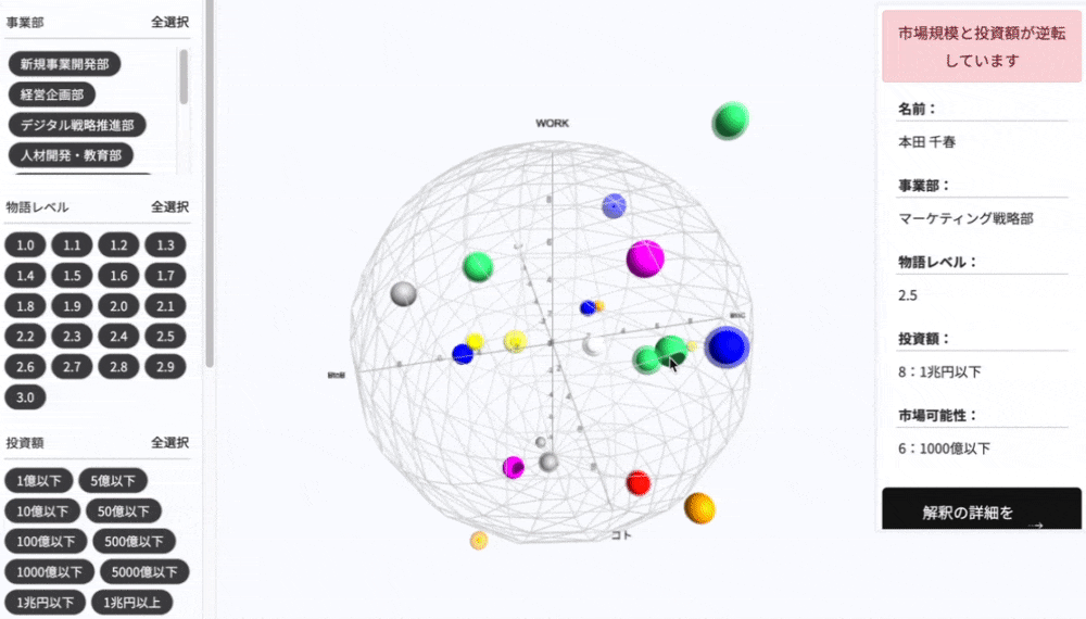 T3 sphereは、「社員―解釈者―意思決定者」の三者の関係において個人の願いを企業戦略マップ上に可視化するツールです。